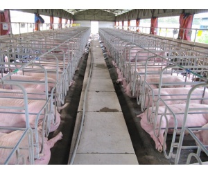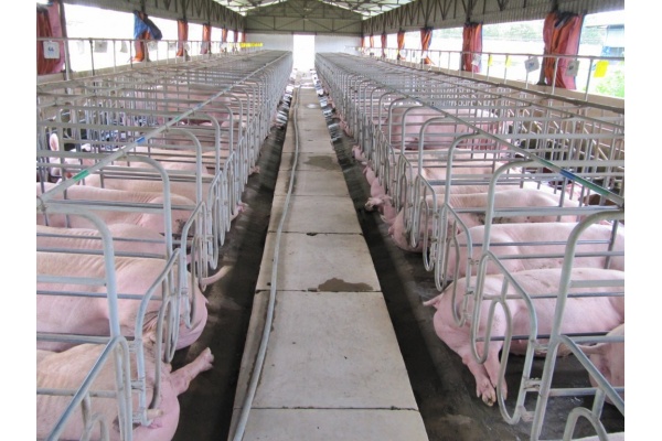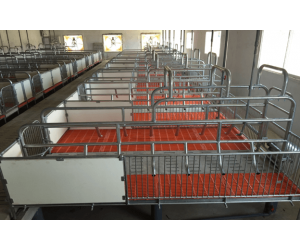 Chuồng heo nái đẻ dùng tuýp tráng kẽm, Khung chuồng được làm bằng ống tráng kẽm hai mặt, Sàn đan bê tông cho heo mẹ, sàn nhựa cho heo con, Máng ăn inox cho heo mẹ